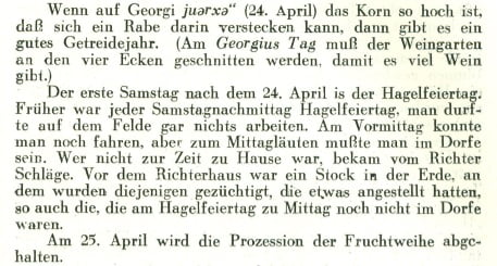 24. und 25. April – Fekeder Brauchtum 2020.09.18. in Fekedi hagyományok_de Auszug aus dem Buch „Volkskundliche Beobachtungen in der Rhön-Siedlung Feked“ von Lygia Kuszter (1939)